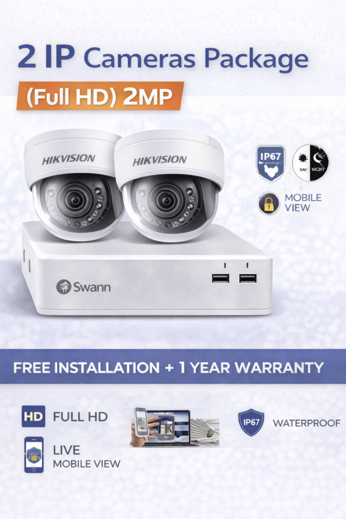 2 Full HD IP Cameras (2.0 MP) package includes high-quality day & night vision cameras, a 4-channel network video recorder supporting up to 2.0MP, 500GB hard disk drive, 4-port PoE switch, 150 feet CAT-6 copper wiring with RJ45 connectors, waterproof bullet camera connections, NVR cabinet (locker), complete wiring with ducting, live mobile view access, and waterproof camera junction boxes, along with free installation and a 1-year warranty.