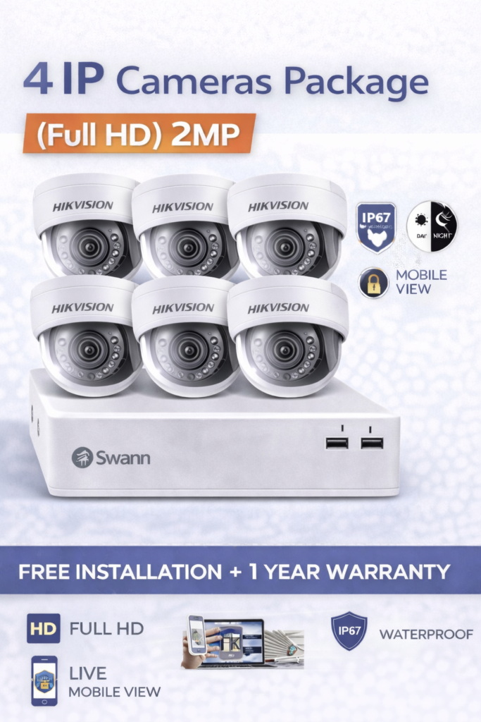 4 IP Cameras Full HD (2.0 MP) package includes high-quality day & night vision cameras, a 4-channel network video recorder supporting up to 2.0MP, 500GB hard disk drive, 6-port PoE switch, 200 feet CAT-6 copper wiring with RJ45 connectors, waterproof IP67 bullet cameras, NVR cabinet (locker), waterproof connection boxes, complete wiring with ducting, live mobile view access, along with free installation and a 1-year warranty.