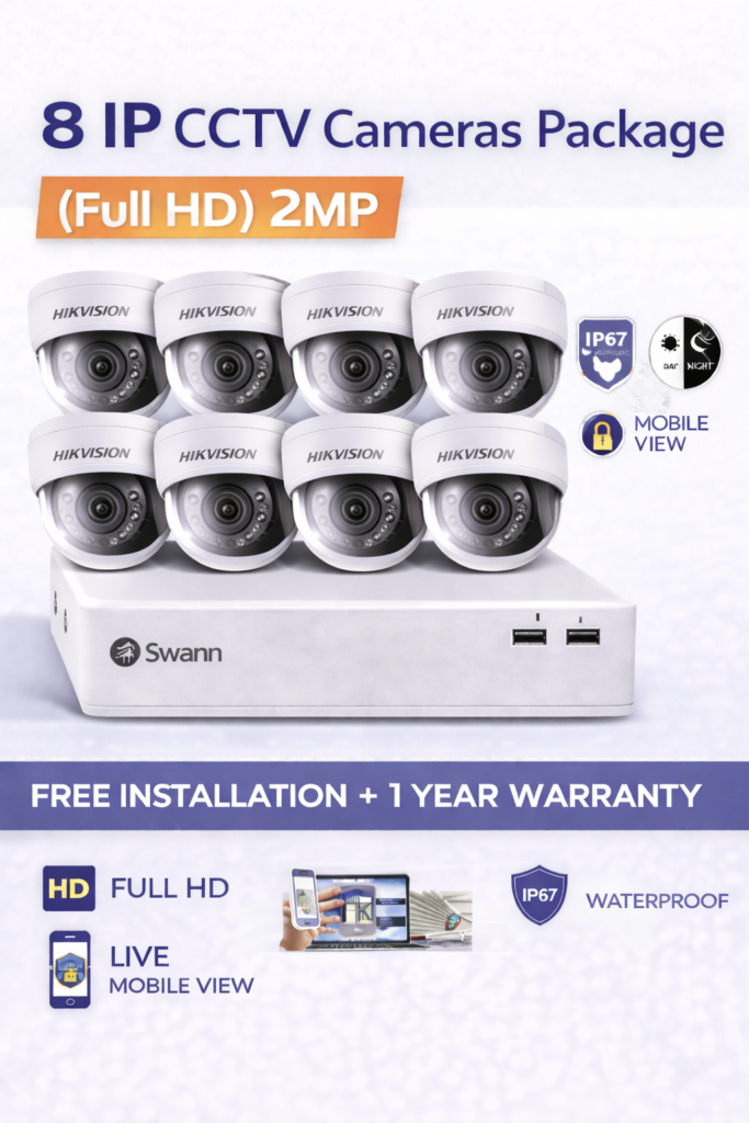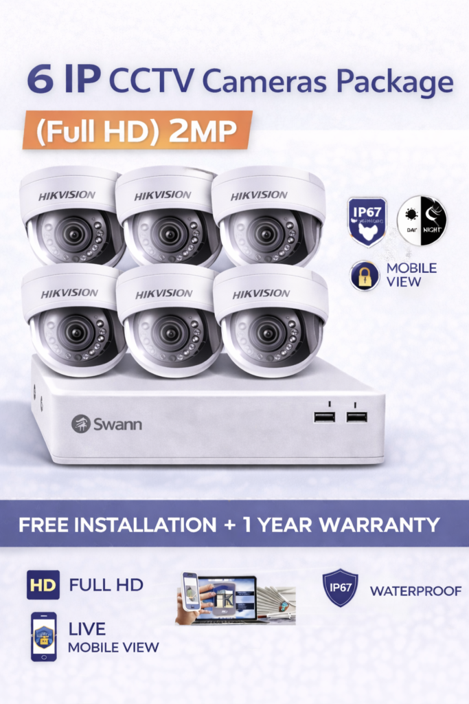 6 Full HD IP CCTV Cameras (2.0 MP) package includes high-quality day & night vision cameras, an 8-channel network video recorder supporting up to 2.0MP, 500GB hard disk drive, 8-port PoE switch, 300 feet copper wiring with connectors, waterproof IP66 CCTV cameras, waterproof connection boxes, complete wire ducting, switch box, NVR cabinet, live mobile view access, along with free installation and a 1-year warranty.